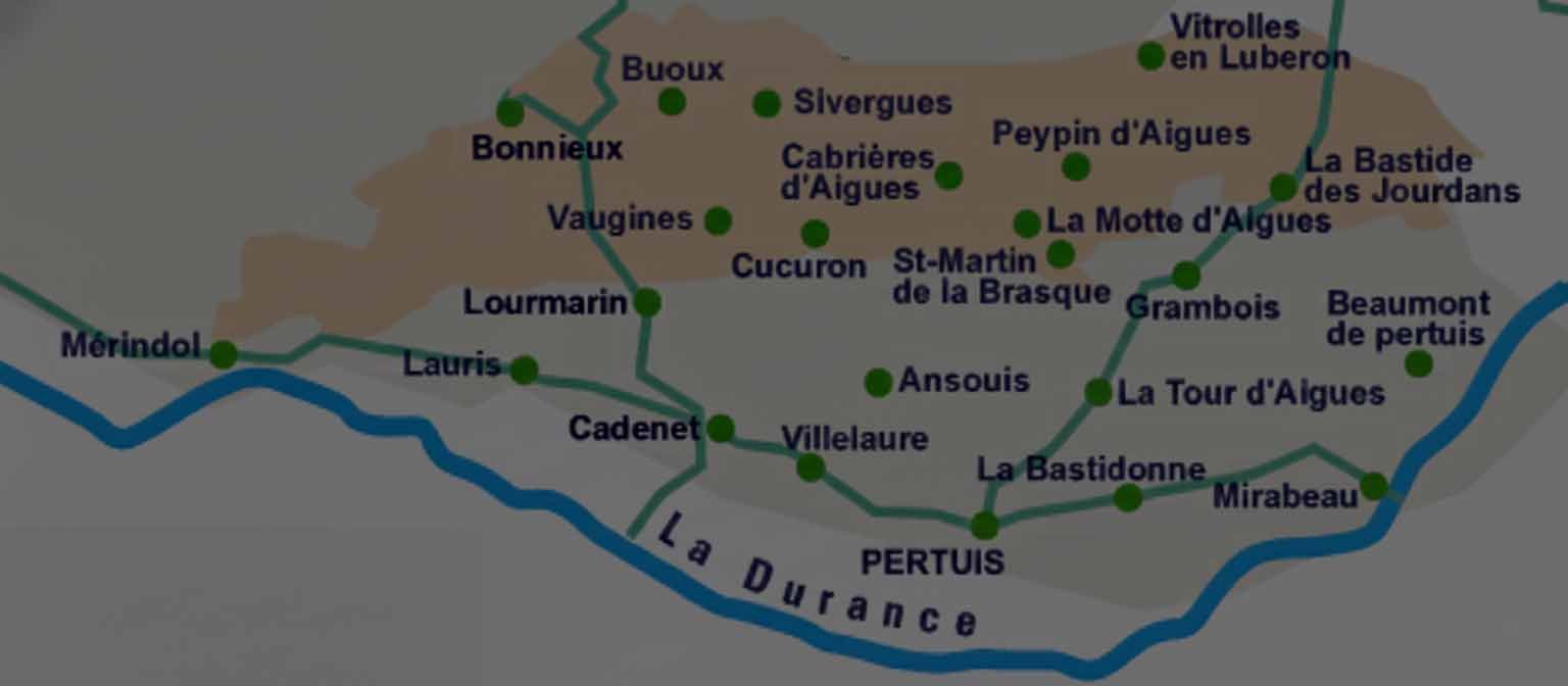 - et tout l'arc nord et central avec Lauris, Lourmarin, Vaugines, Cucuron, Ansouis, La Motte-d'Aigues, Cabrières-d'Aigues, Peypin-d'Aigues, Vitrolles-en-Luberon ou encore Grambois et La Bastide-des-Jourdans.